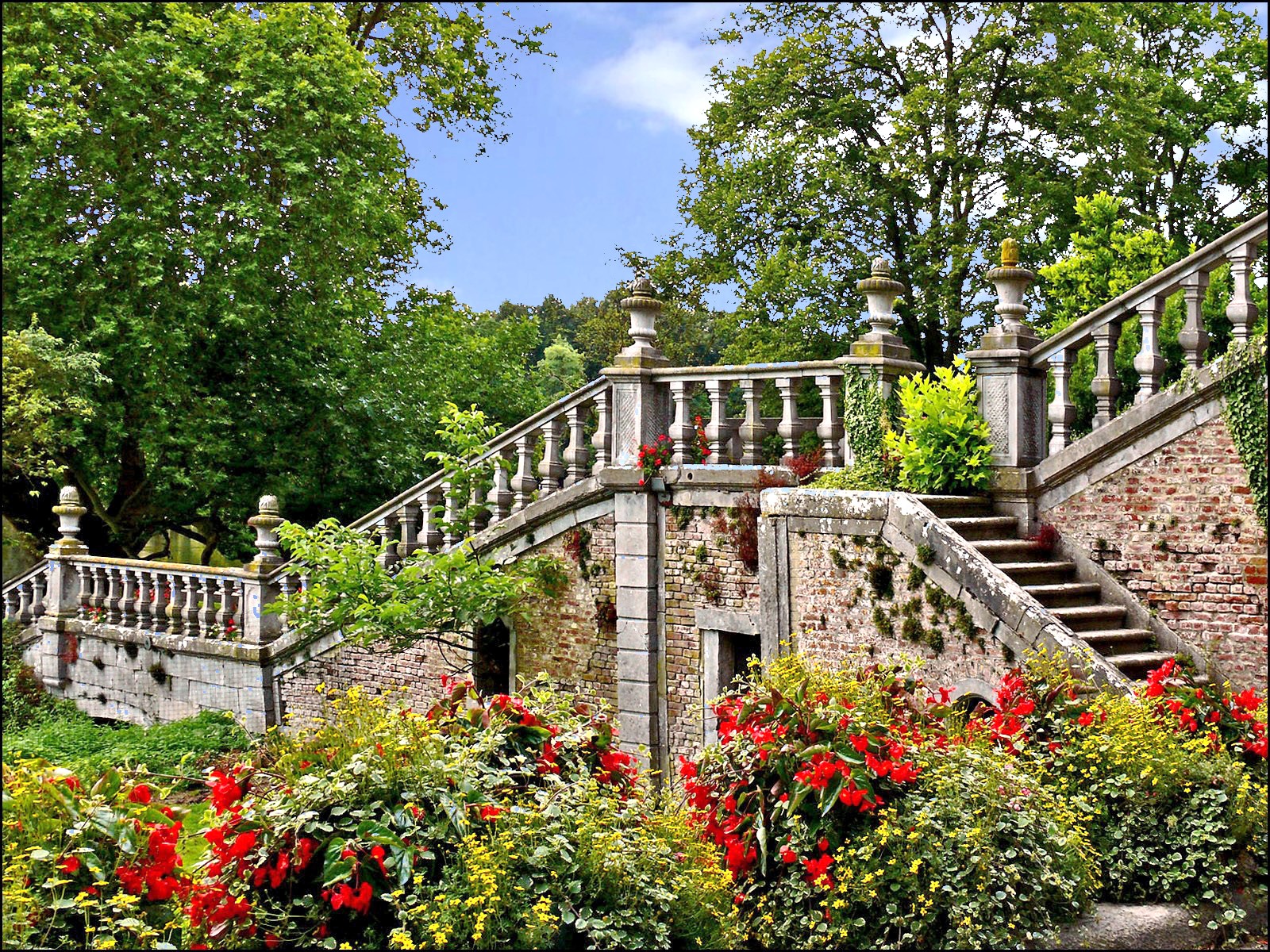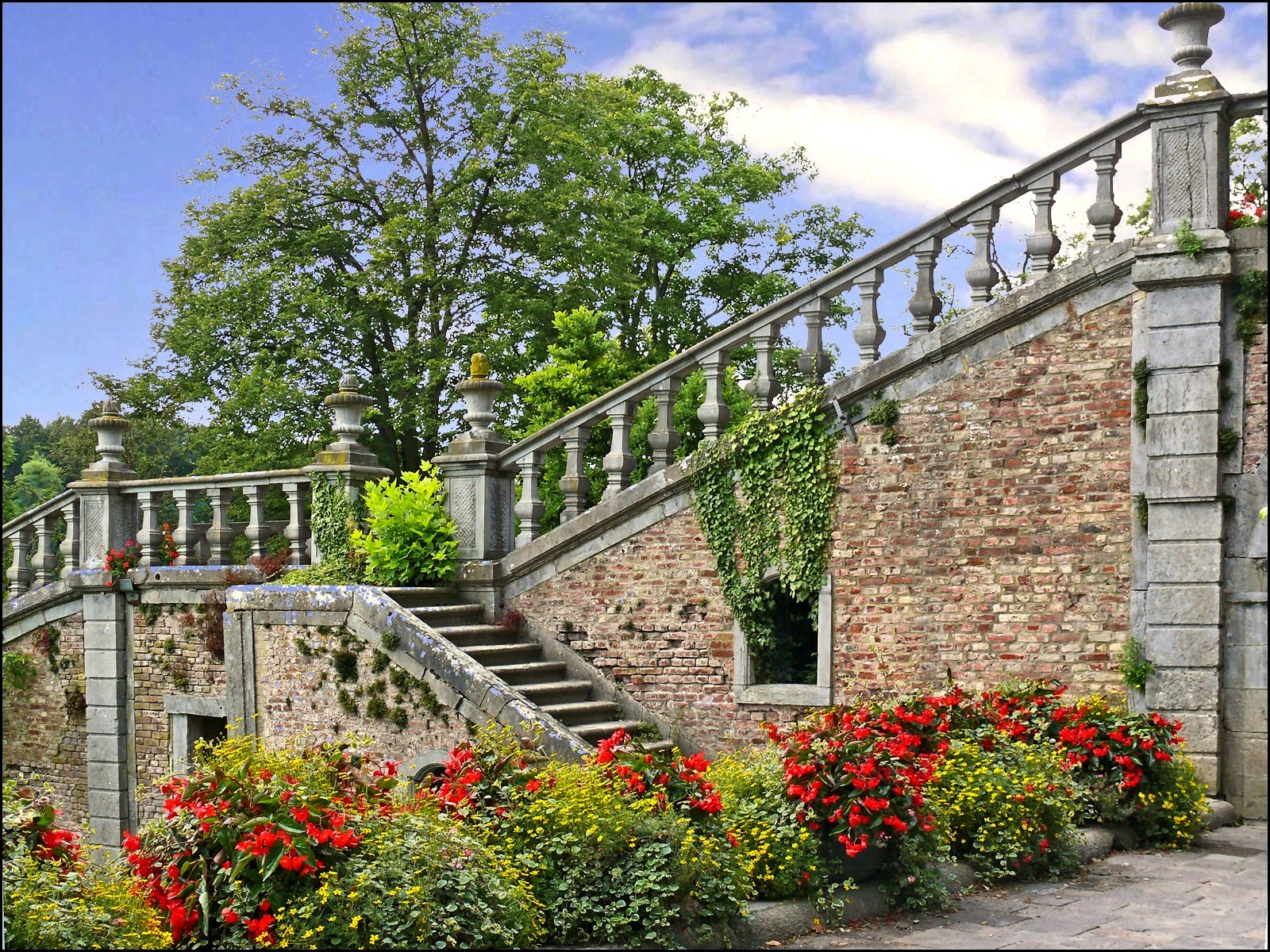 Bonjour Harmony, de très belles photos de cet escalier, avec la belle végétation et le ciel bleu, ces vieilles pierres offrent une vue magnifique. Je découvre que cet immense domaine est devenu le Parc Paradisio, où vivent de nombreuses espèces d’animaux menacées. Un havre de paix pour toutes ces bêtes. Bonne journée. Bisous.