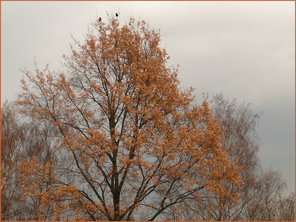 J’aime bien la première photo cet arbre à la couleur cuivré avec ces deux oiseaux perchés au sommet, le ciel couvert avec ces nuages gris font un bel ensemble.