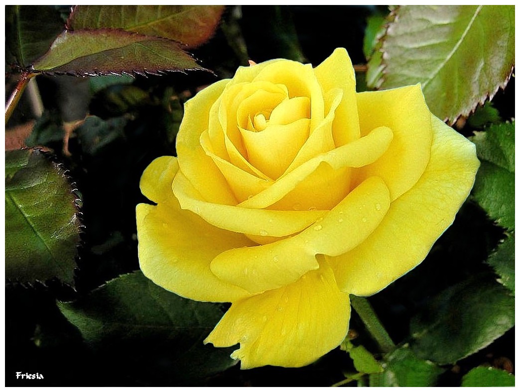 « Friesia » rosier à fleurs groupées de Kordes, jaune d’or brillant, s’éclaircissant à la défloraison, son parfum est puissant et agréable.