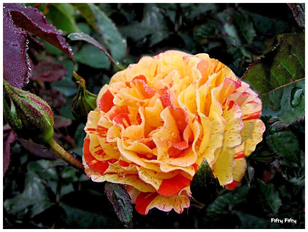 « Fifty Fifty » Rosier aux fleurs d’un surprenant mélange de couleur, strié de orange et de jaune. Les fleurs sont bien mises en valeur avec un feuillage bronze et pourpre.