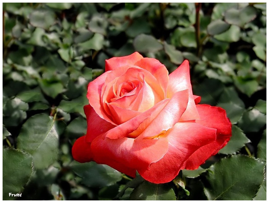 « Fruité » Obtention du rosiériste Meilland de 1985 est un rosier à fleurs groupées. Elles sont de couleur orange capucine et lorsqu’elles s’épanouissent se teinte de rouge plus soutenu, parfum délicat.