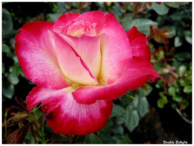 « Double Delight » rosier buisson grosses fleurs, cette variété fut obtenue en 1978 par H.Swim et A.Ellis., couleur crème ourlée de rouge au parfum épicé.