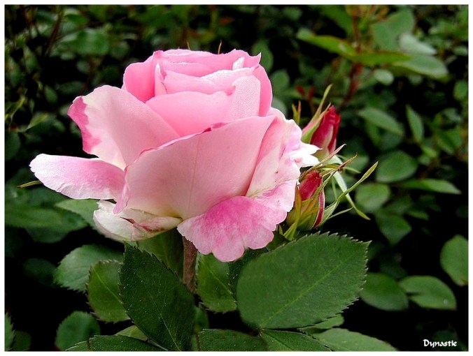« Dynastie » le créateur de cette rose est Meilland en 1993, rosier buisson à grandes fleurs, doubles, légèrement parfumées et de couleur rose de Chine à l’envers des pétales et blanc crème aux revers.