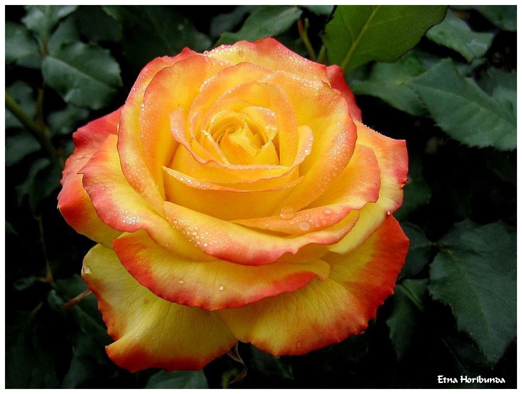 « Etna Horibunda » rose de serre à grandes fleurs aux couleurs somptueuses du jaune/orangé ourlé de rouge carmin avec un feuillage vert foncé brillant, très jolie en bouquet mais n’a pas de parfum.