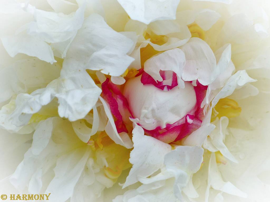 Coucou ma Belle, j’arrive doucement sans bruit à pas de souris, quelle belle pivoine, j’en connaissais des roses ou prunes mais blanche, elle est magnifique avec ses couleurs rouge et or en son cœur, tu l’as bien choisie avec la pureté et la sincérité du blanc, mélangées à un peu de passion dans un cœur d’or!!