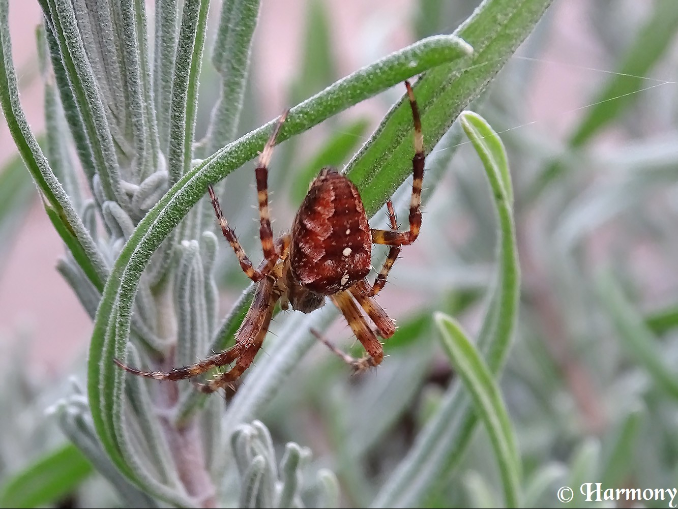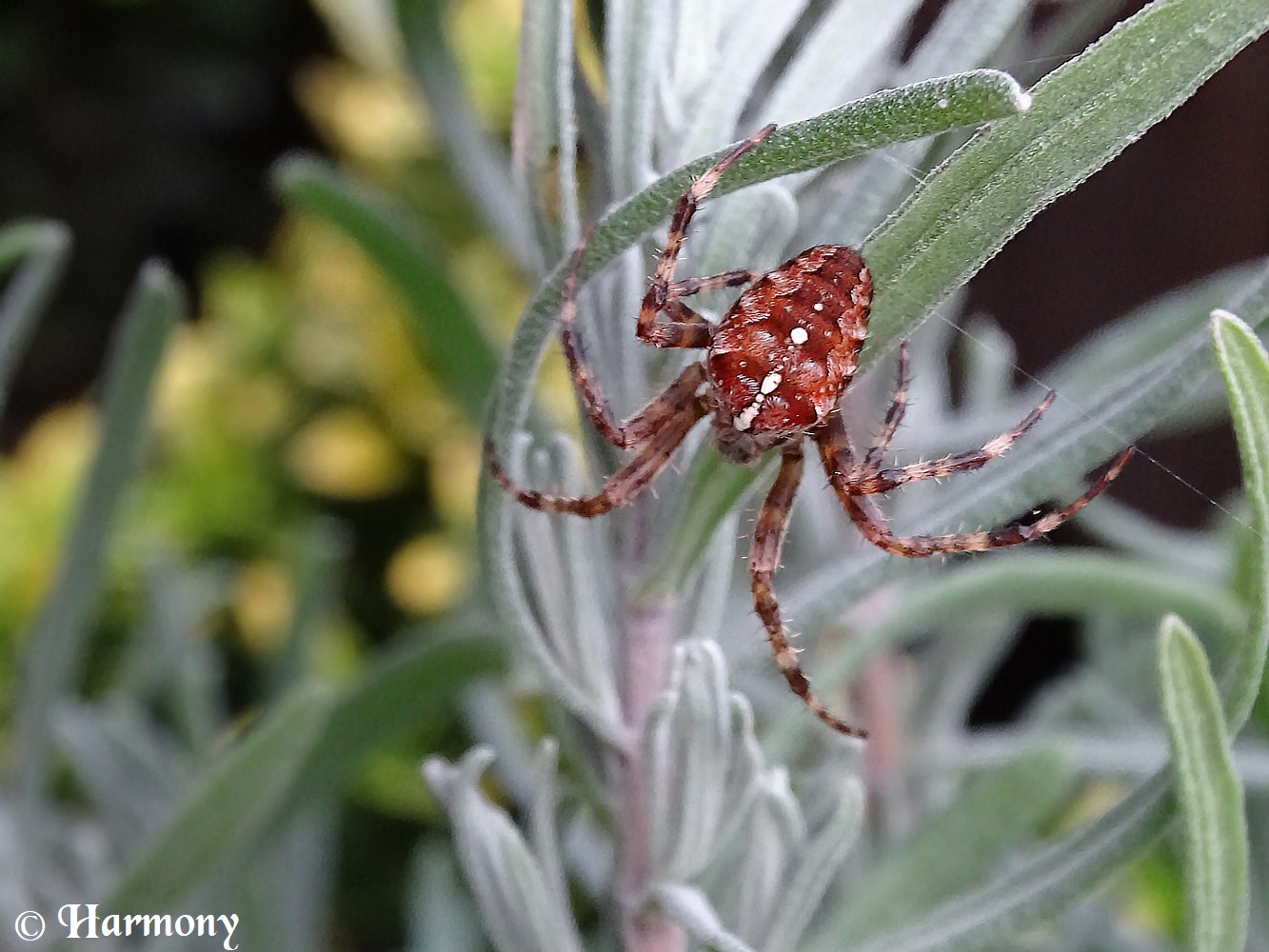 Merci d’apprécier les macros de cette araignée qui tentait plutôt de se cacher car je l’avais dérangée en brisant sa toile.J’ai été obligée de bouger un peu les brins de lavande pour qu’elle se montre et la prendre en photo mais finalement,elle s’est réfugiée beaucoup plus bas où les brins sont touffus.