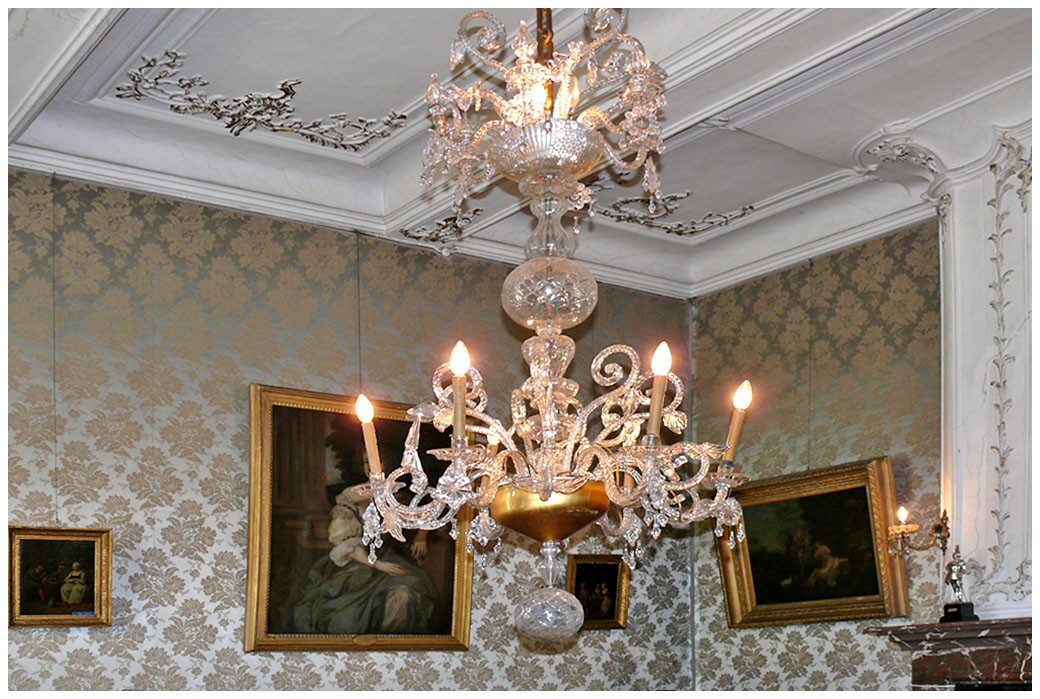 Au plafond,un lustre de cristal daté du XVIIIème siècle,de travail liégeois.
