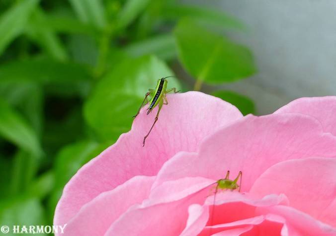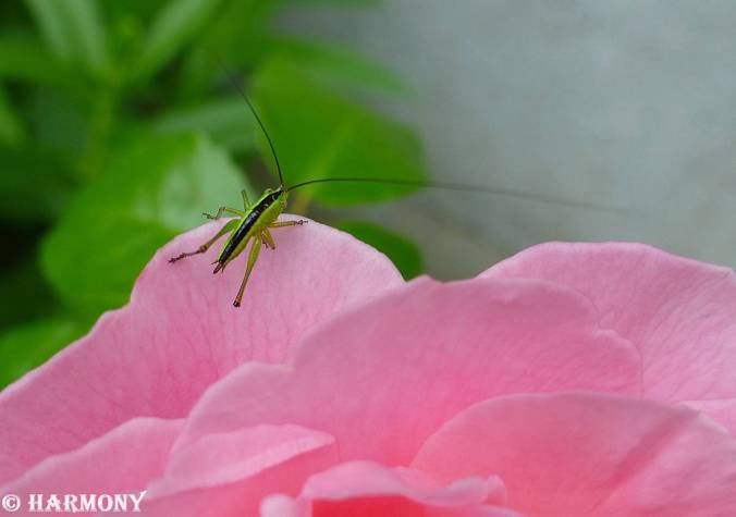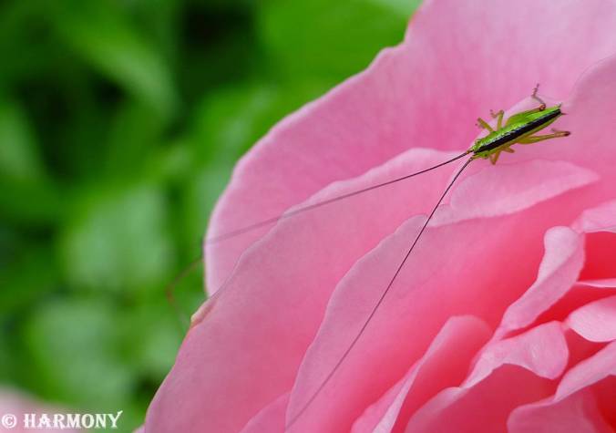 C’était en juin et je photographiais les roses quand soudain,je l’aperçus…….cela ressemblait à une sauterelle mais tellement petite!C’est peut-être une jeune mais si quelqu’un pouvait le confirmer,je suis preneuse. 😉