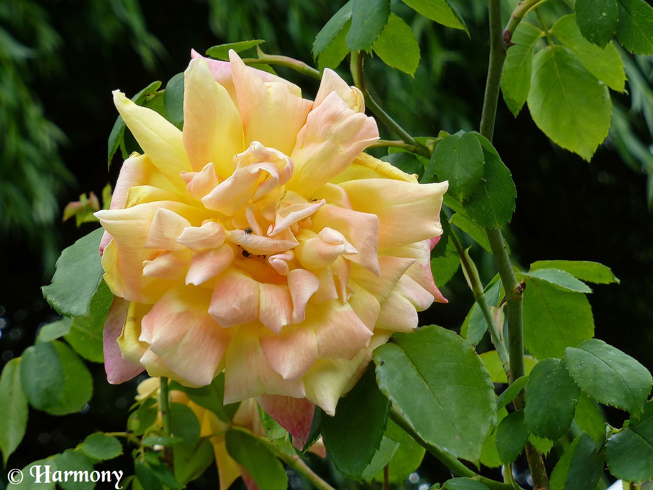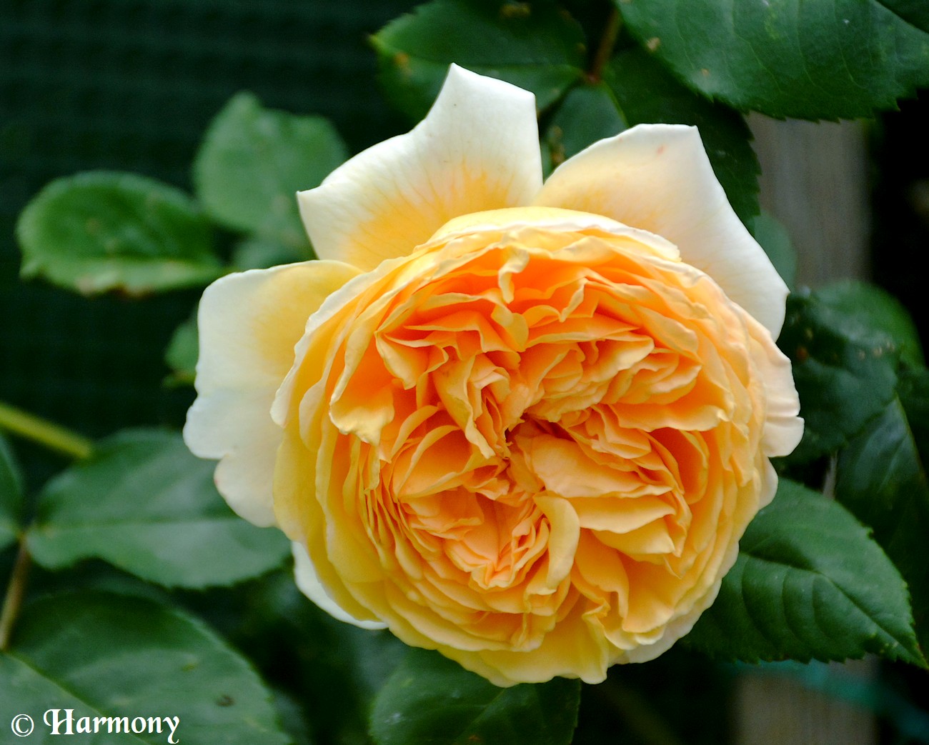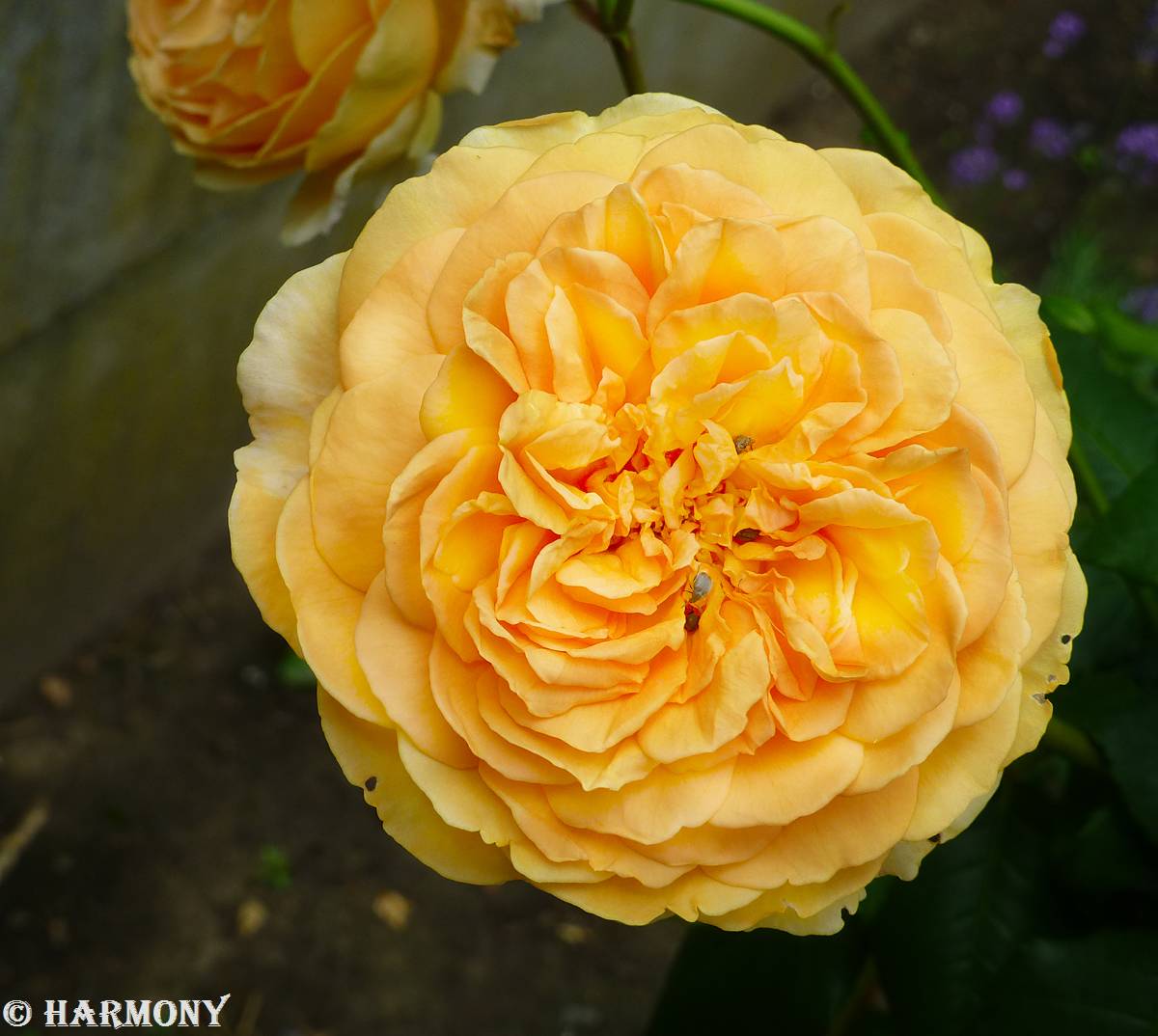 Ce rosier exhibe de nombreux bouquets de corolles ébouriffées, jaune abricoté,